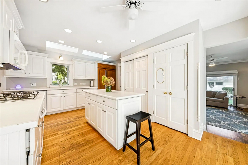 To unify the renovation, the existing hardwood floors were refinished throughout the kitchen and adjoining spaces. The refreshed flooring adds a modern flare and continuity, reinforcing the open-concept design and tying the renovated kitchen into the rest of the home.
