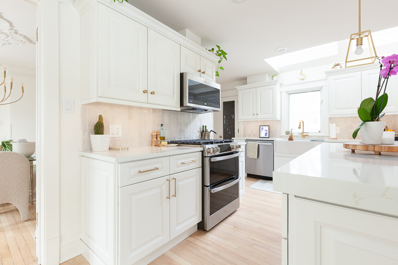 The kitchen itself was updated with new base cabinetry designed for clean lines and efficient storage. Light-toned countertops and a soft, textured backsplash were selected to keep the space feeling bright and timeless while adding subtle visual interest without overpowering the room.